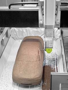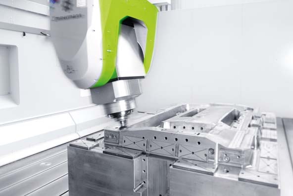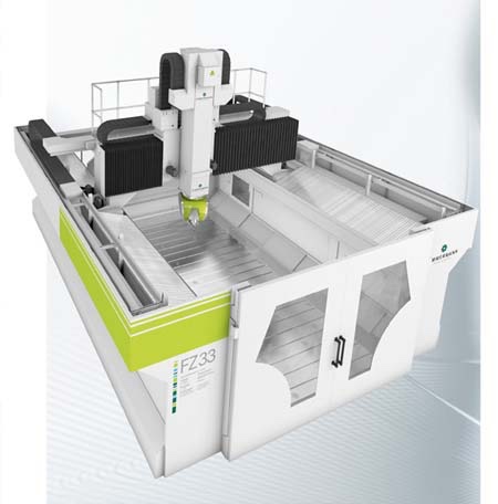 此图像显示的是实际运行中的 FZ33。它正在将工件铣削成原型车辆。其精度设定了新的标准。得益于我们的 HPLS 系统,不管是精致的细节还是泛泛的表面加工,Zimmerman 龙门铣床的铣削成果都堪称完美。